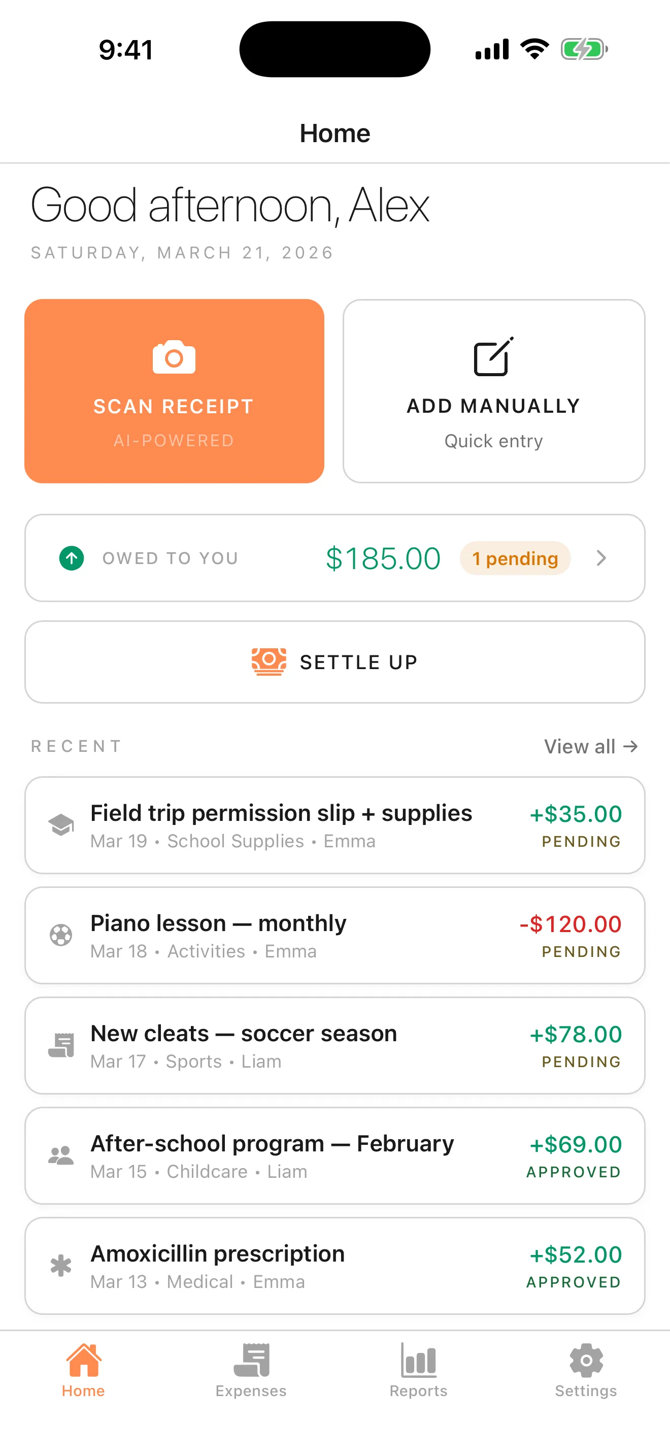 I've been co-parenting and splitting expenses 50/50 for 9 years. I tried spreadsheets, shared notes, text files in a "kids expenses" folder — something was always broken. Receipts got lost. Settling up ate hours every month. Fairness felt like something I had to hope for, not something I could see.